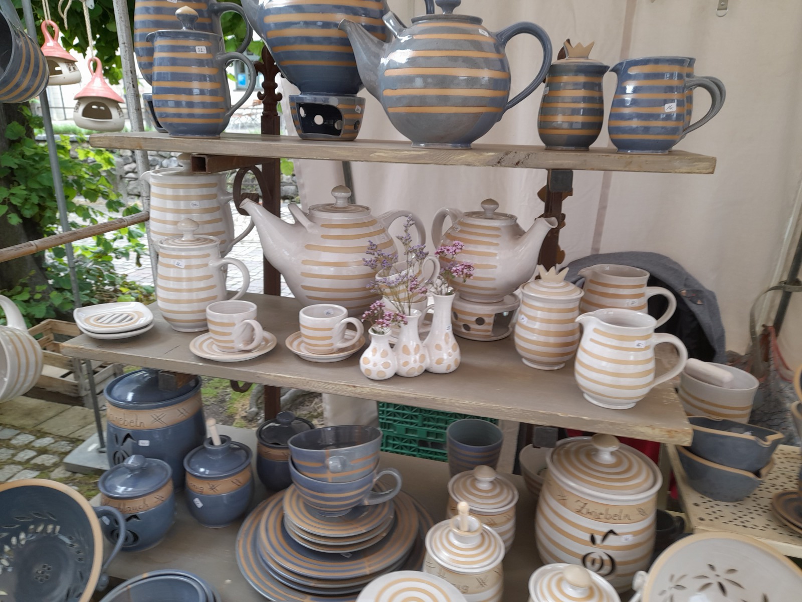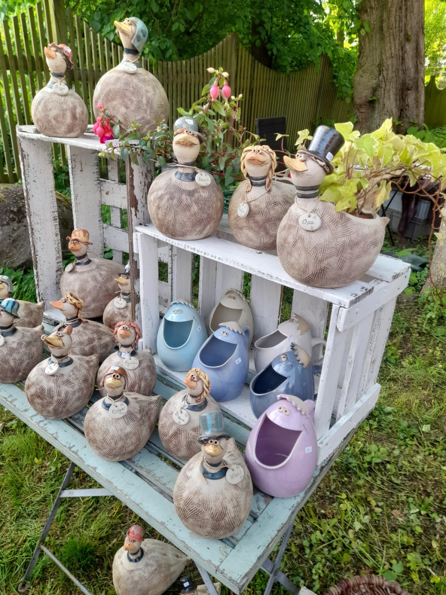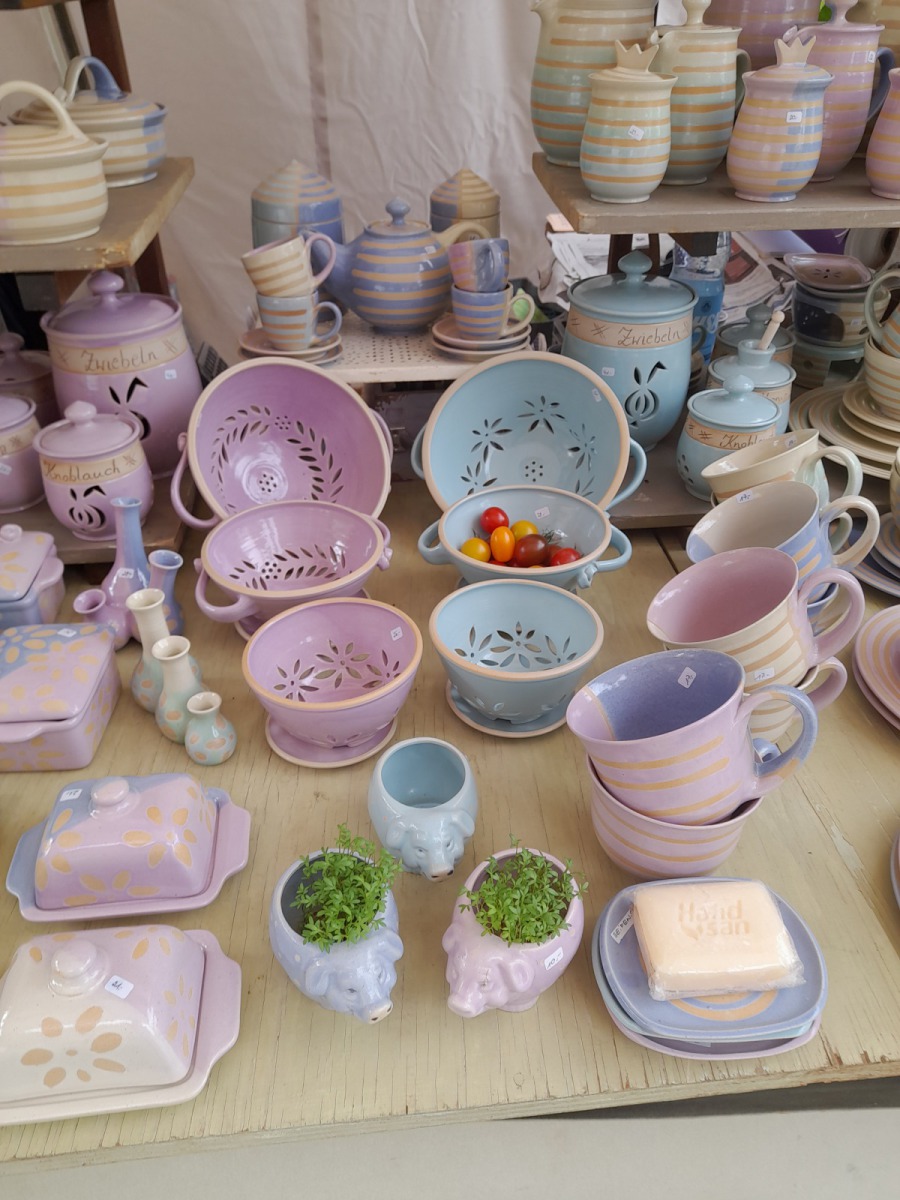 Cornelia Kielinger betreibt das Atelier „Der gute Ton“. Der Name ist Programm: Ihr Gebrauchsgeschirr sorgt mit seinen Pastellfarben schon beim Betrachten für gute Stimmung. Zur Gestaltung ihrer Kannen, Tassen, Schalen und Teller verwendet Kielinger selbstentwickelte Feldspatglasuren. Und wer noch einen weiteren Schub guter Laune braucht, kann nach Cornelia Kielingers heiteren Gartenvögeln Ausschau halten.
