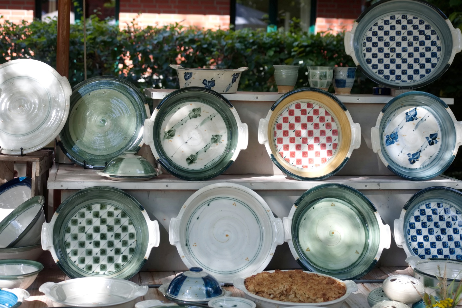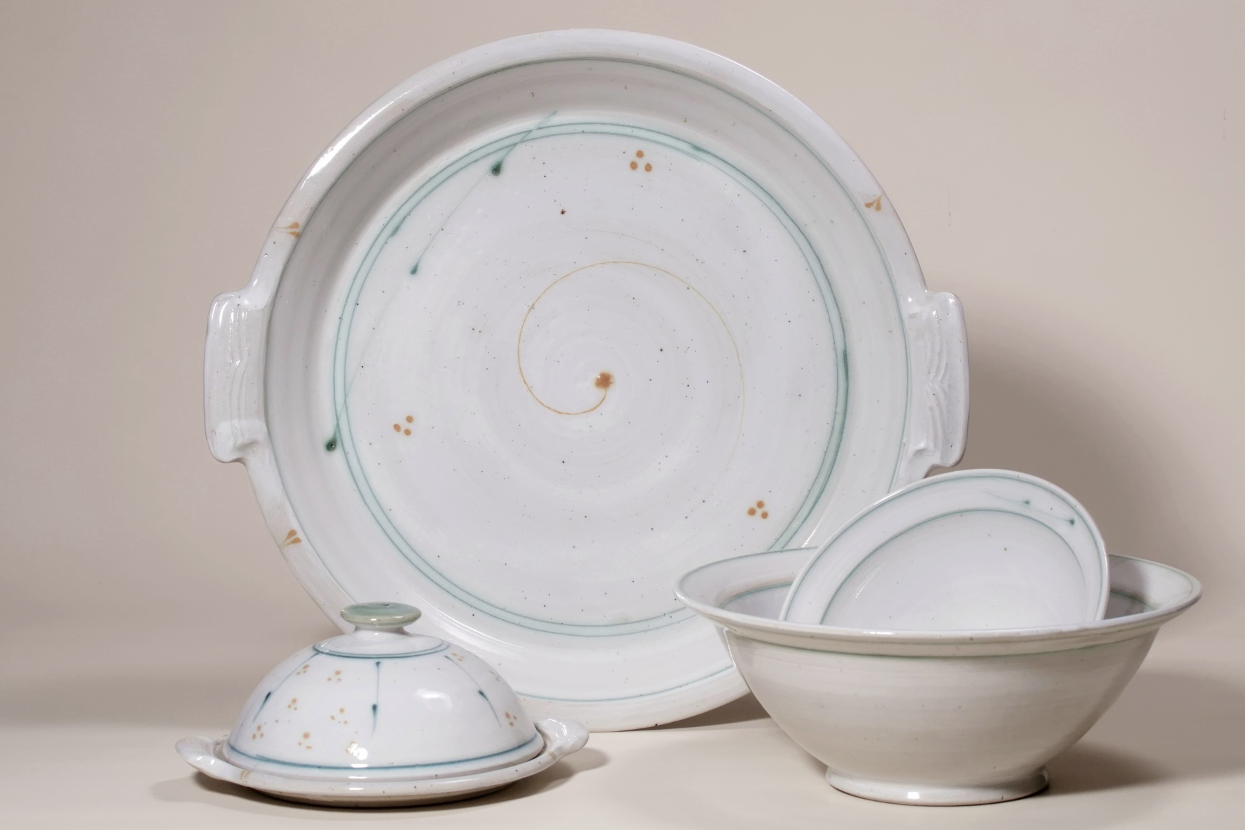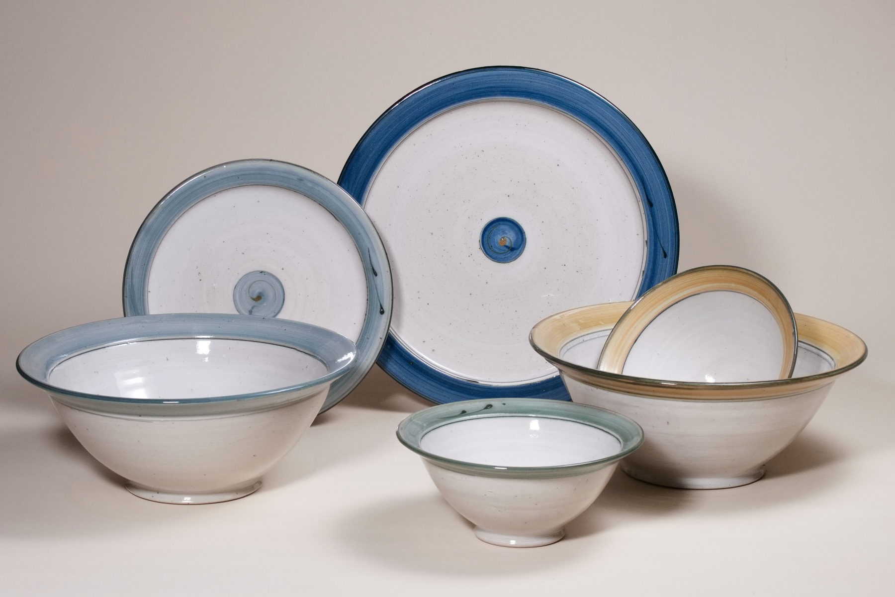 Frank Breiter fertigt frei gedrehtes Steinzeug für den täglichen Gebrauch. Sein Sinn für feine Details und eine luftige Farbpalette verleihen seinen Tellern und Dosen, Tassen und Schalen eine freundliche Leichtigkeit. Die zarten Engobedekore trägt er mit Pinsel, Malbällchen und Stempeln auf. Neben dem charmanten Geschirr bietet Frank Breiter auch praktische Back- und Auflaufformen an.