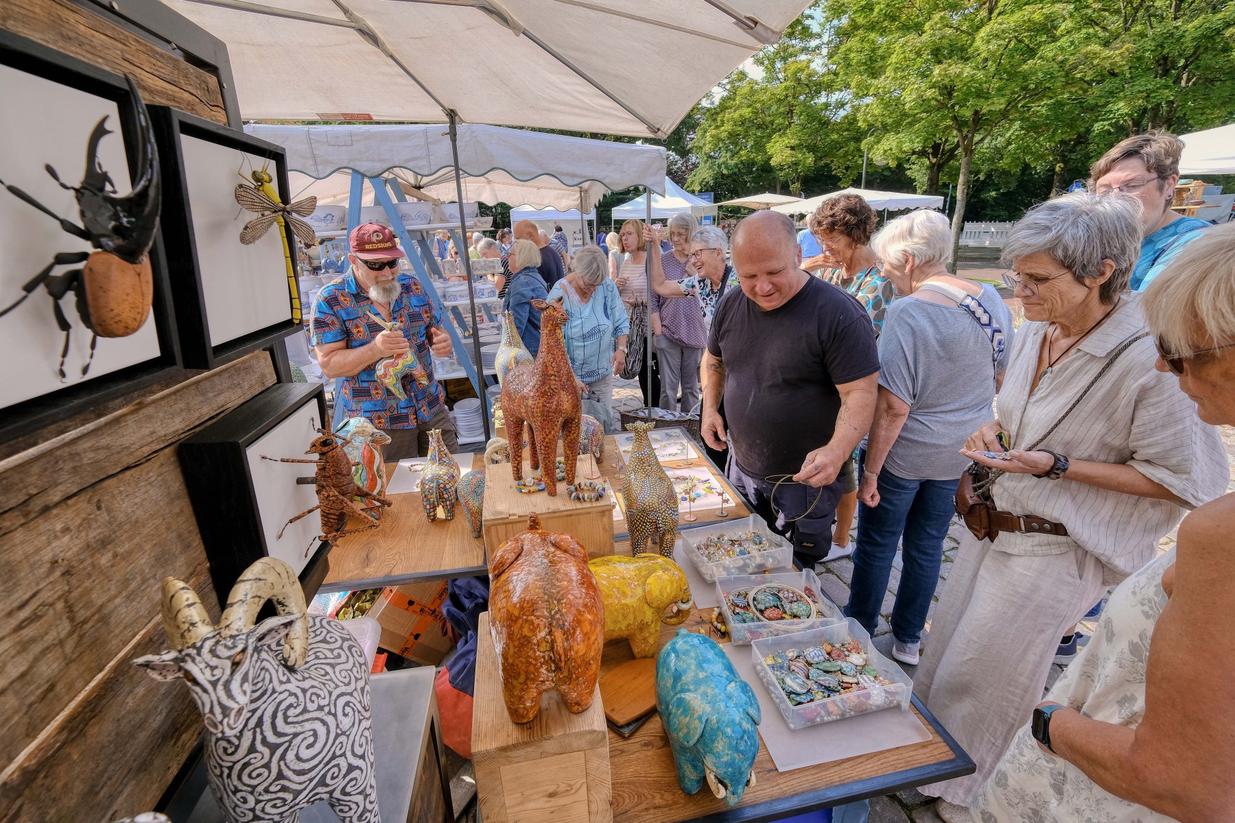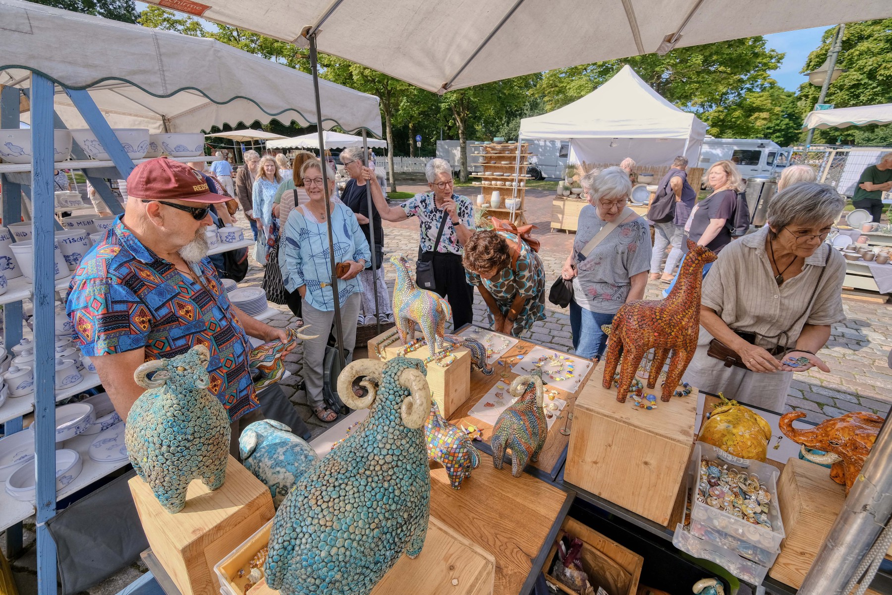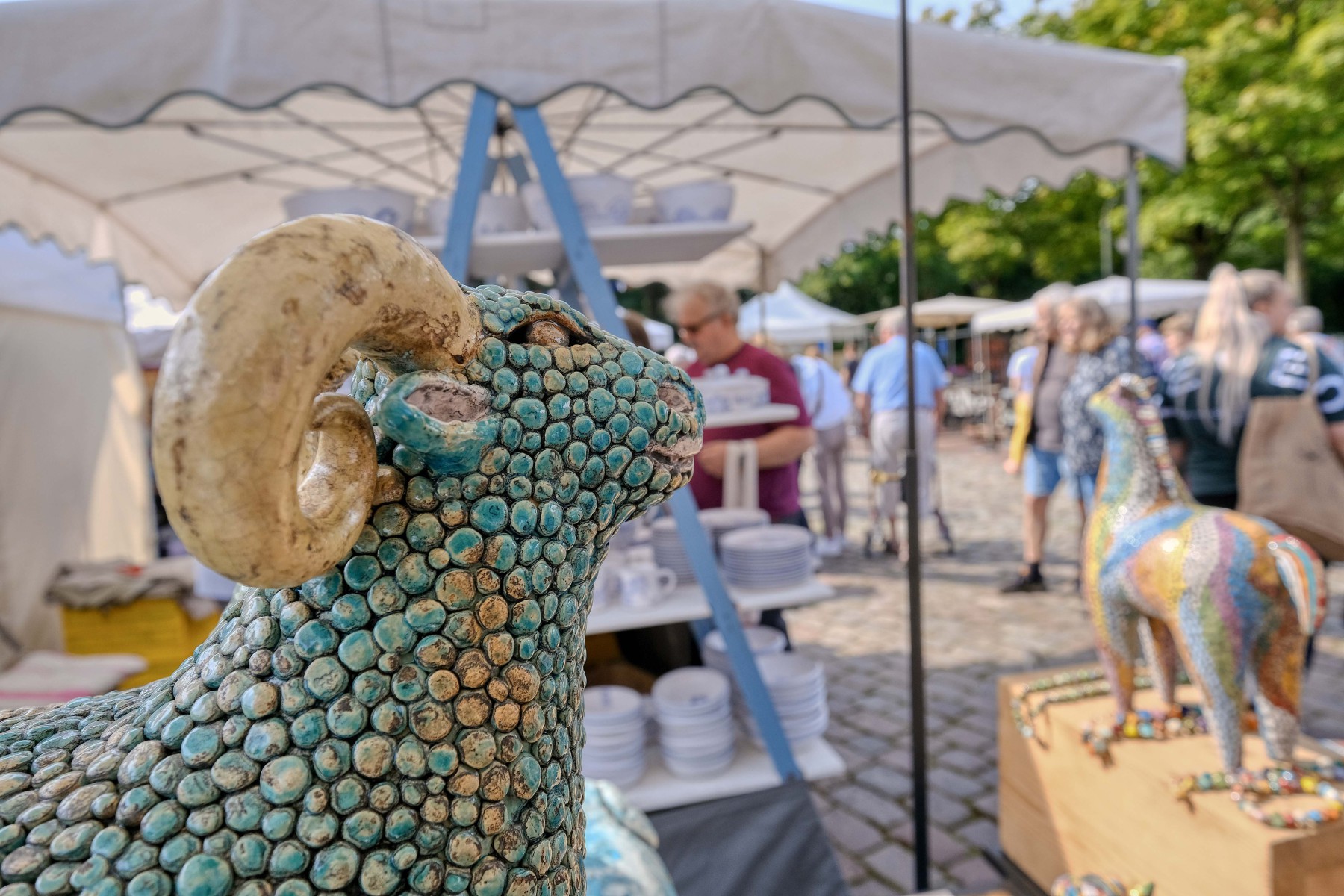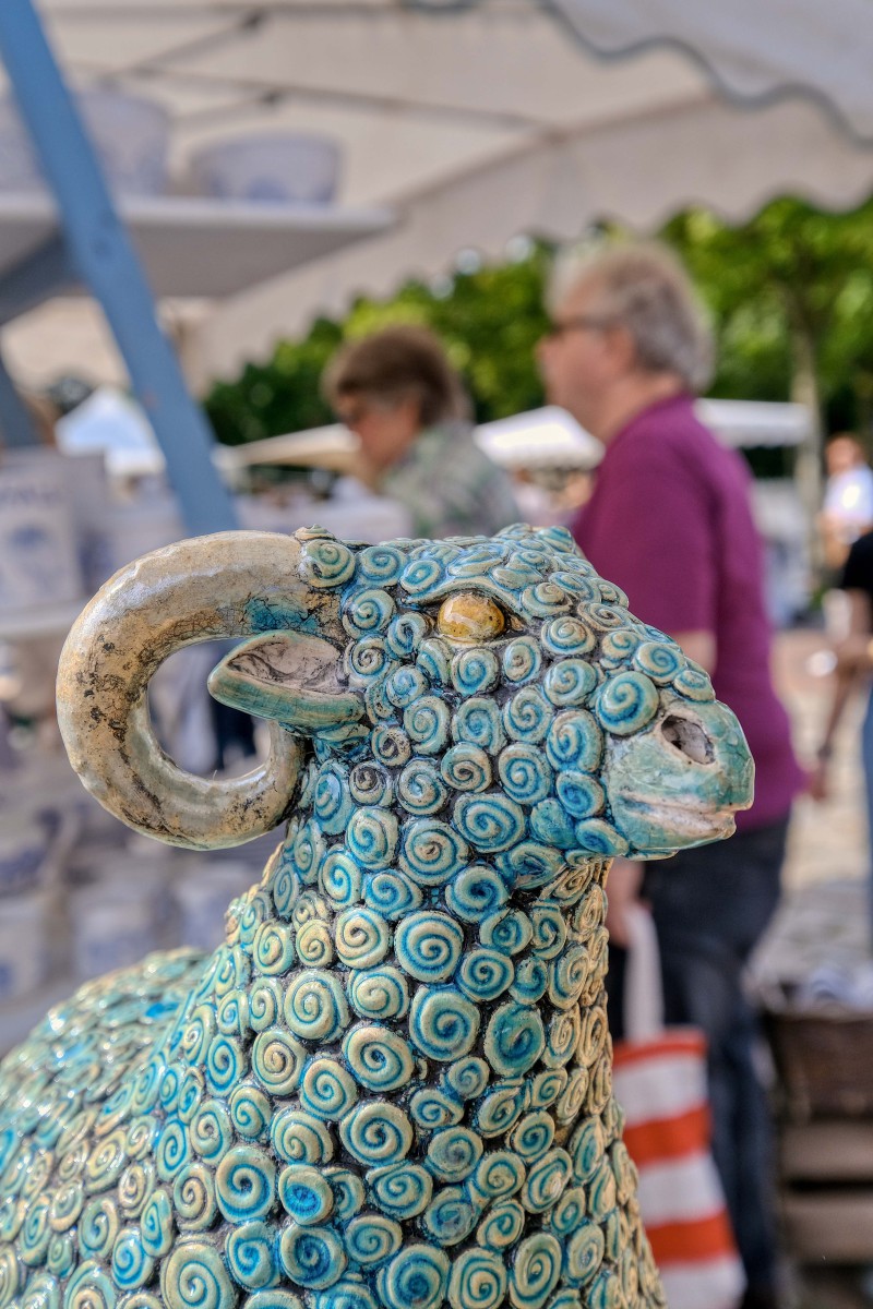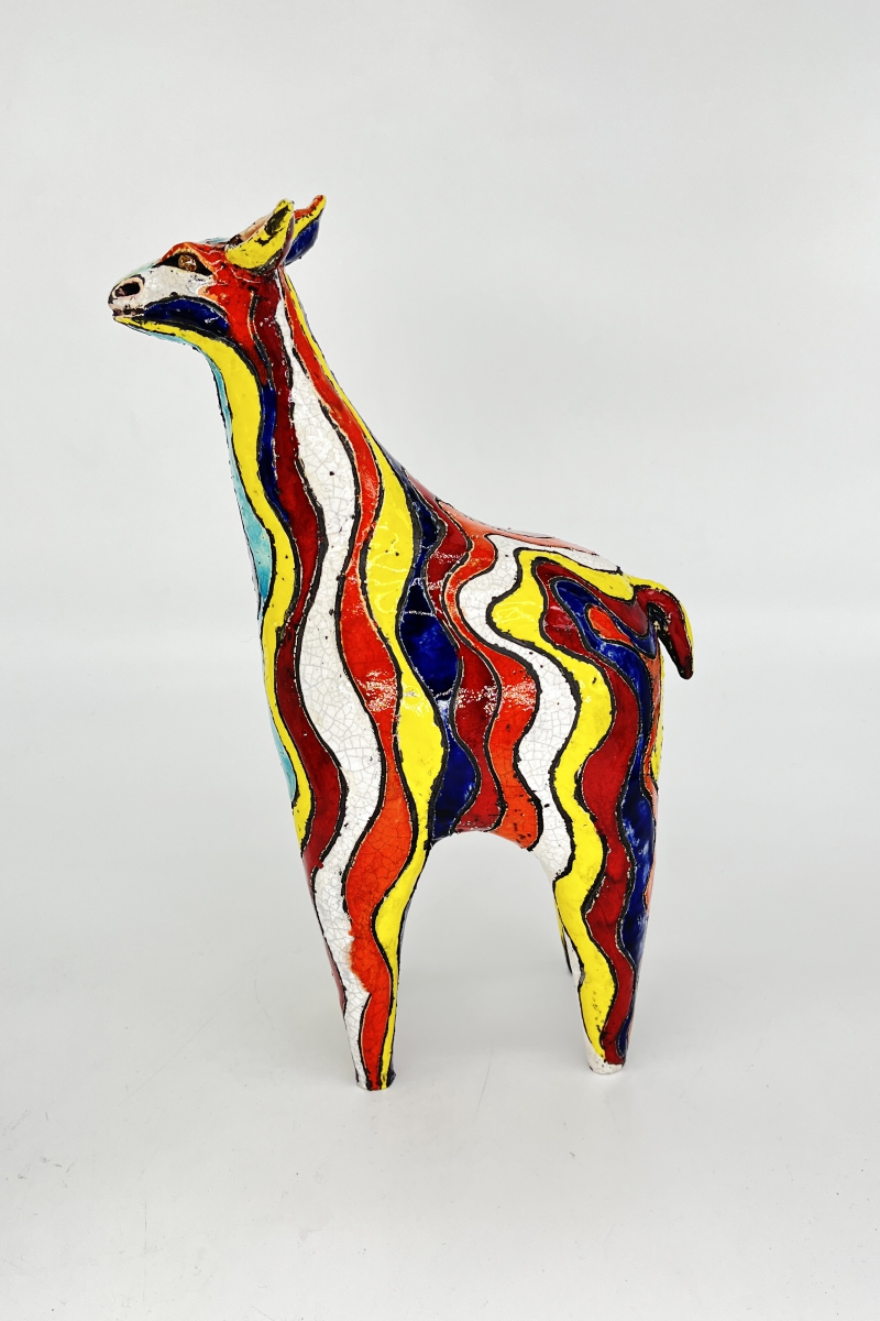 So fabelhaft bunt wie ein mittelalterliches Bestiarium sind Klara Kallenbachs keramische Tierplastiken. Stolz recken die auf das Wesentliche reduzierten Tiere ihre Häupter empor. Ihre Körper sind übersät von bunten Mustern aus Punkten oder farbigen Linien, die den Oberflächen der Figuren ein bewegtes Eigenleben verleihen. Angesiedelt zwischen Archaik und Hundertwasser hat jedes Tier seinen eigenen Charakter und ist ein absoluter Hingucker.