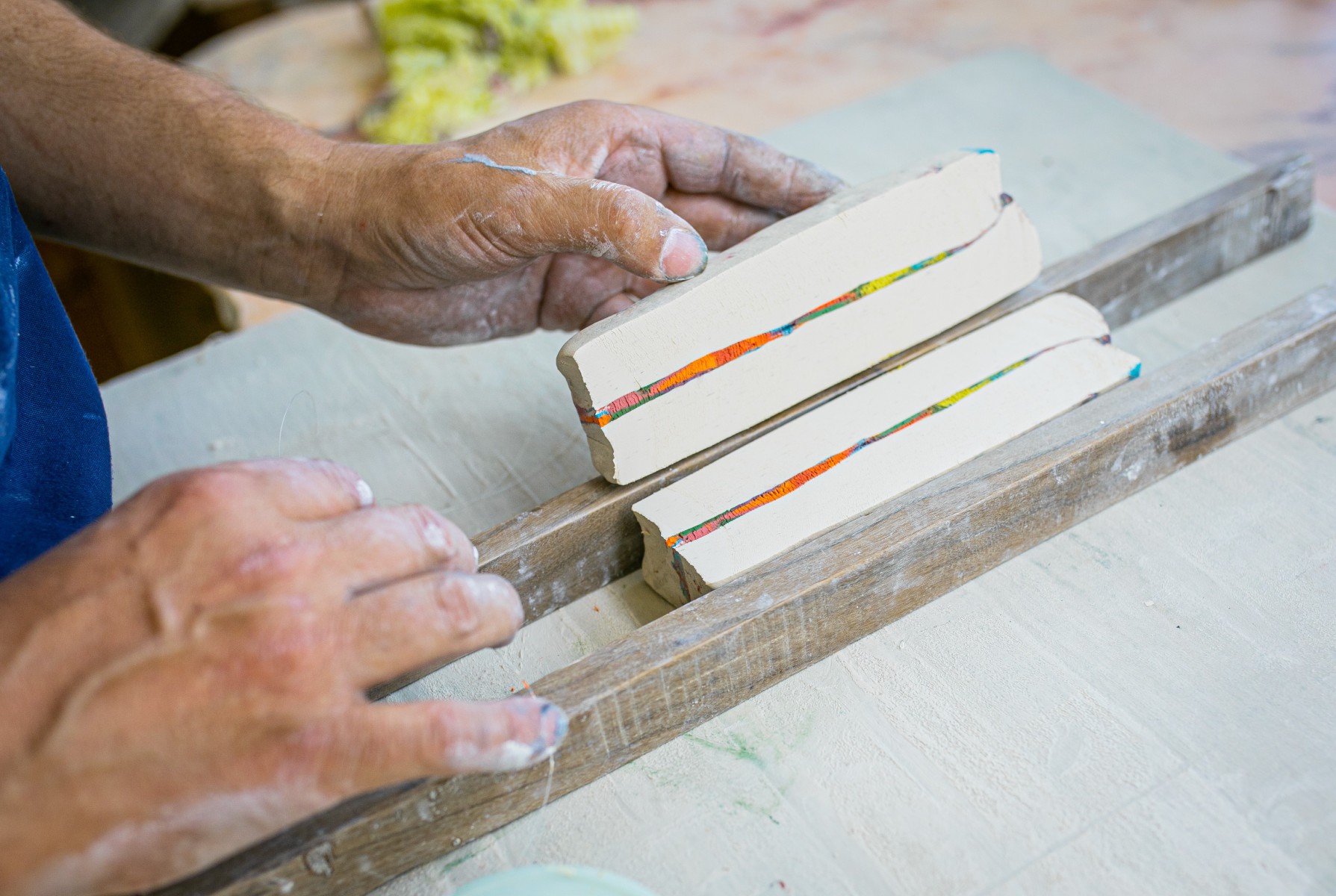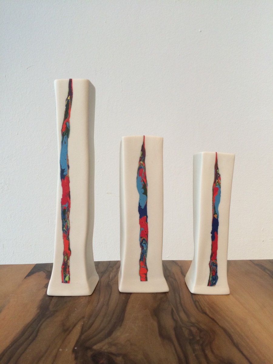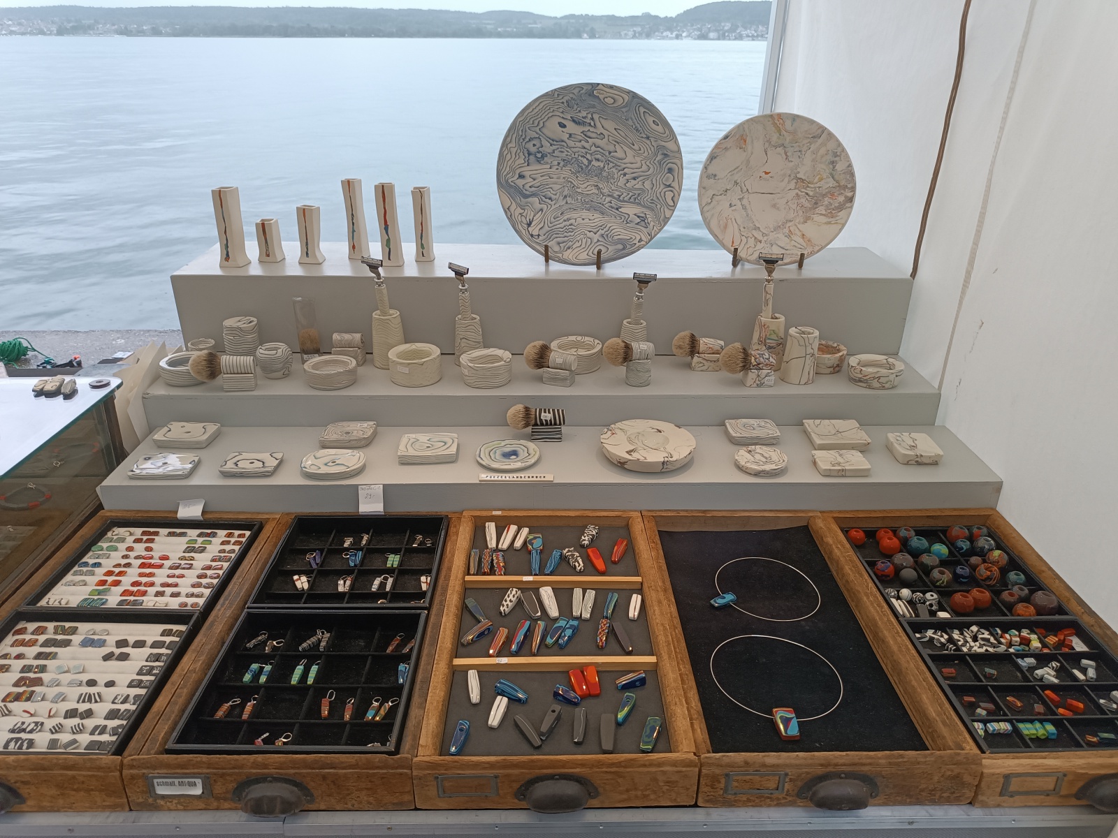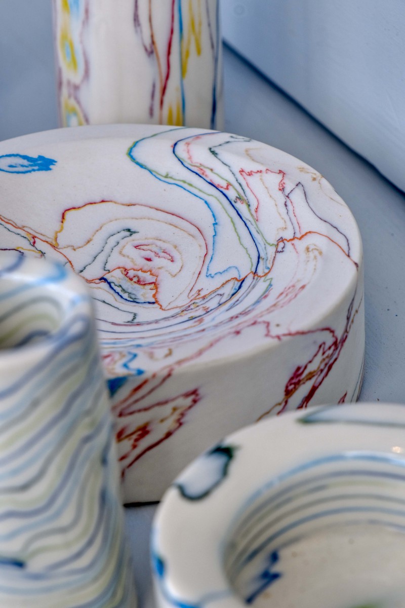 Schalen und Vasen aus Porzellan sind nichts Ungewöhnliches, aber farbig leuchtender Schmuck oder fein marmorierte Rasiersets aus diesem Material lassen sich wohl nur bei Rainer Braun finden. In einem aufwändigen Verfahren verleiht er dem weißen Porzellan kräftige Farben, um aus dem so gewonnenen Werkstoff seine formvollendeten Ketten und Ohrringe zu fertigen. Die feinen, kobaltblauen Äderungen, die zahlreiche Arbeiten aus seinem Studio charakterisieren, erzielt er durch eine meisterlich beherrschte Porzellanschichttechnik.