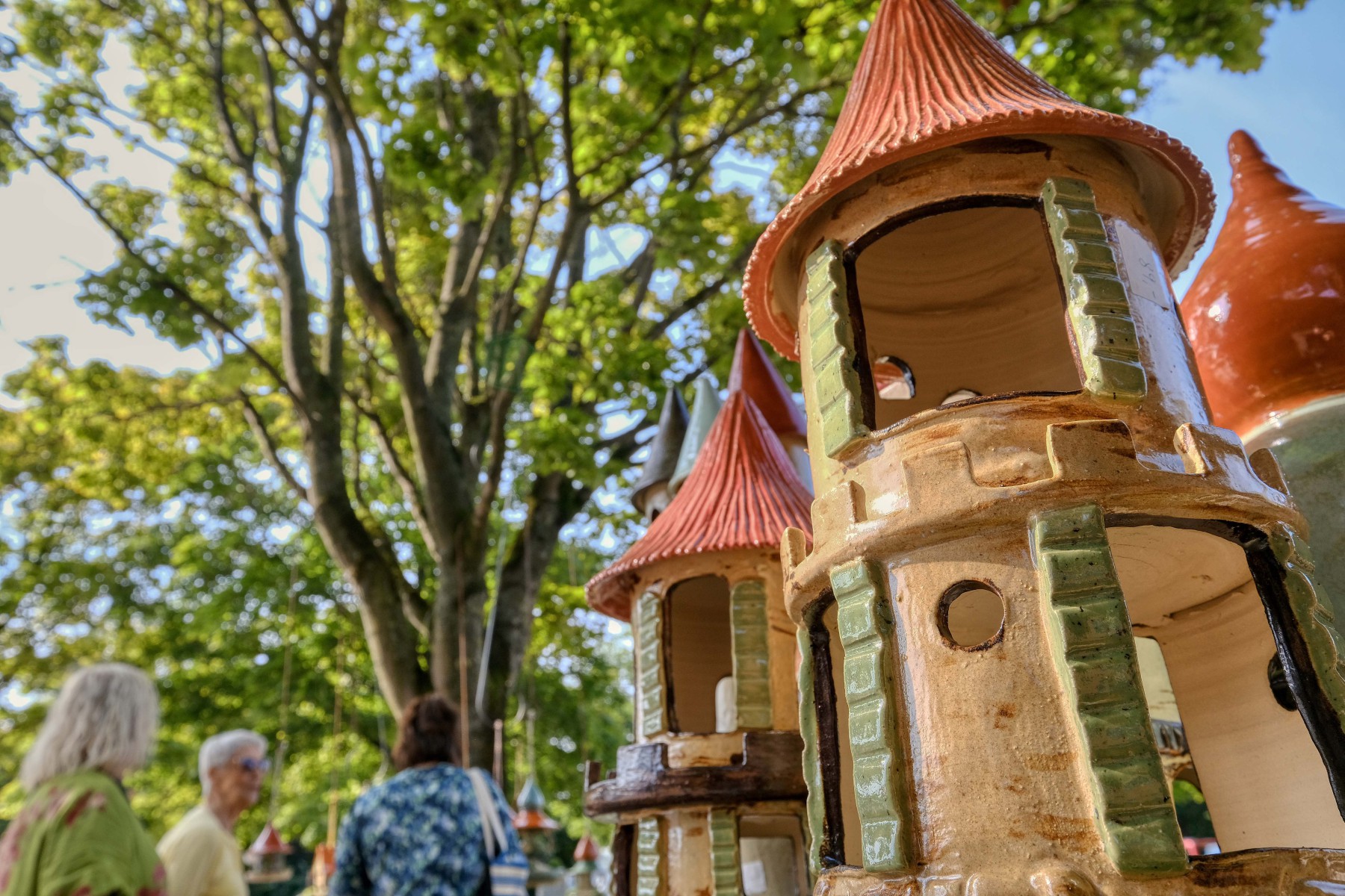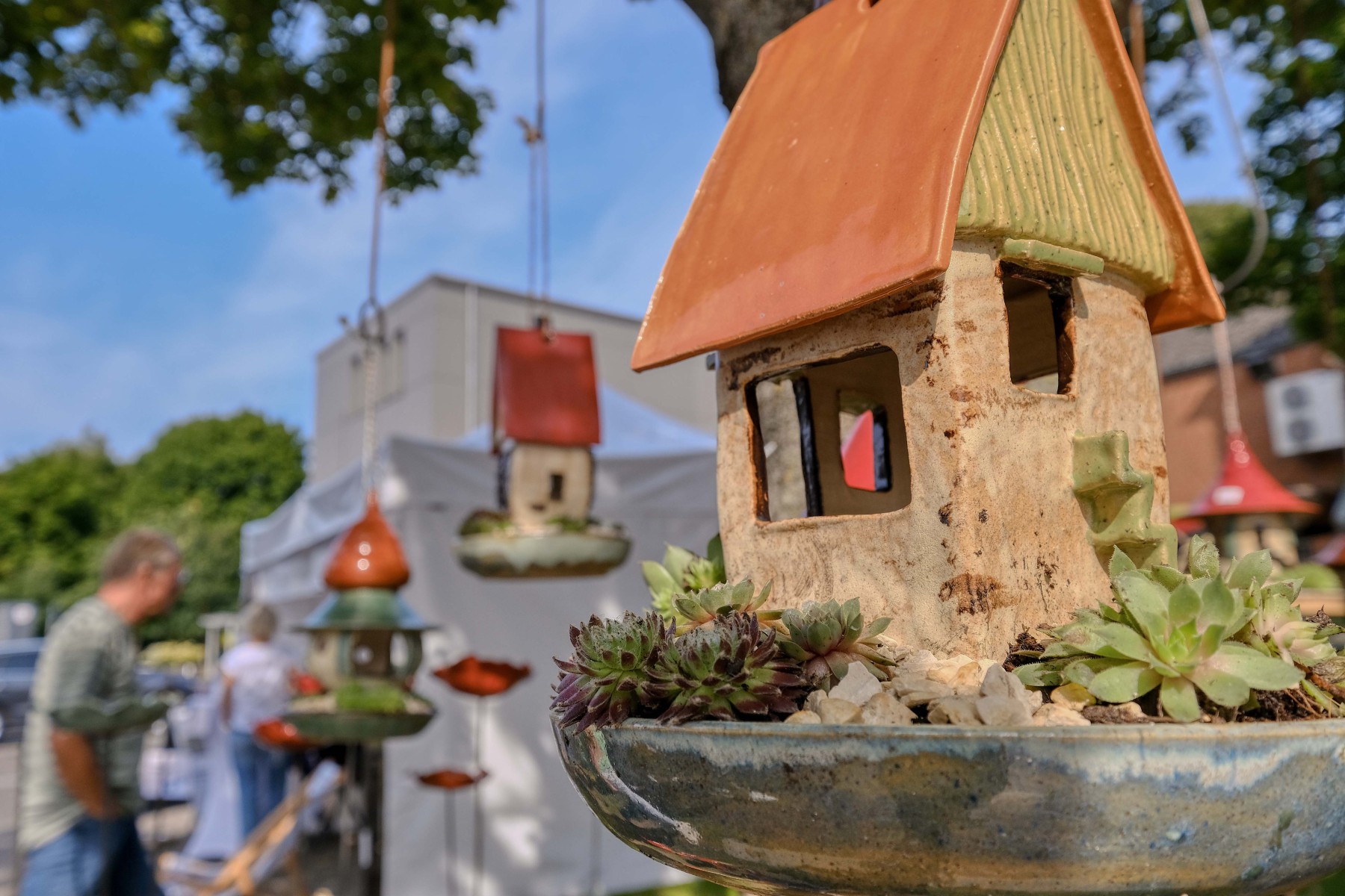 Die originellen Keramiken von Susanne Ehmling verwandeln jeden Garten in ein fantasievolles Märchenland. Die geschmeidigen Formen der Vogelhäuschen fügen sich wie selbstverständlich in ihre natürliche Umgebung ein und sind doch ein Hingucker. Mal gedreht, mal aufgebaut ist ihr keramischer Gartenschmuck das pfiffige I-Tüpfelchen in einem blühenden Garten.